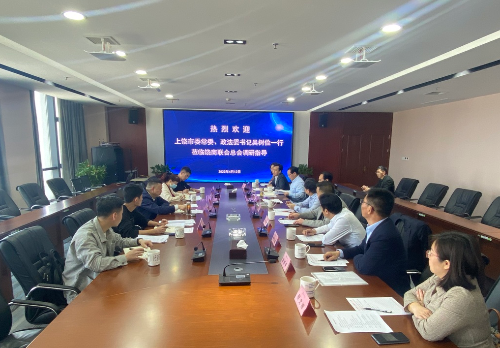 4月12日,上饶市委常委、政法委书记吴树俭一行到饶商联合总会调研座谈,听取饶商企业家对政法机关打造一流法治化营商环境的意见建议。总会会长陈新,联席会长方勇军,常务副会长闵勇、周油建,副会长陈金标、袁新平,联席会长单位代表-宏盛建业投资集团副总裁毛忠华、中大建设法务总监蔡文梅,副秘书长朱志桔等参加座谈。