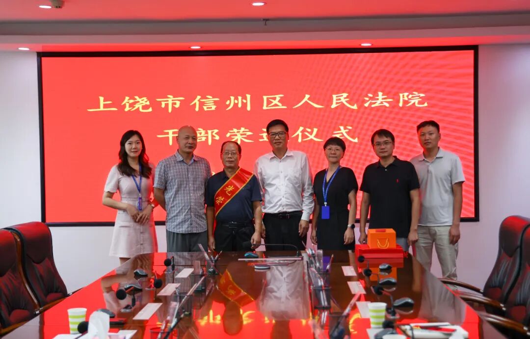为深入落实干部荣誉退休制度,切实增强退休干部的政治荣誉感和组织归属感,9月24日,上饶市信州区人民法院举办干部荣退仪式。院党组书记、院长肖连华及在家班子成员齐聚一堂,共同见证这一光荣时刻,向退休干部黎藜同志致以崇高敬意和美好祝福。